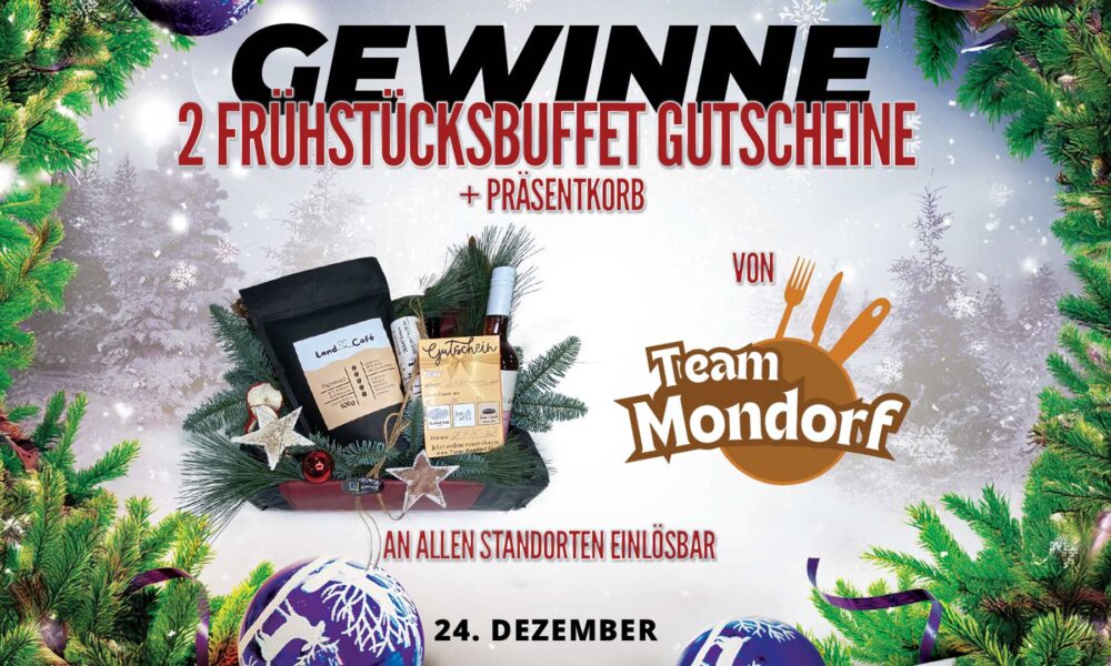 Hinter Türchen Nummer 24 unseres Trude-Kuh-Adventskalenders wartet heute ein Gewinn für alle Genießer: Ein liebevoll zusammengestellter Präsentkorb, inklusive 2 Gutscheinen für ein Frühstücksbuffet am Wochenende in einem von drei ausgewählten Lokalen, gesponsert vom Team Mondorf von Claudi Mondorf.